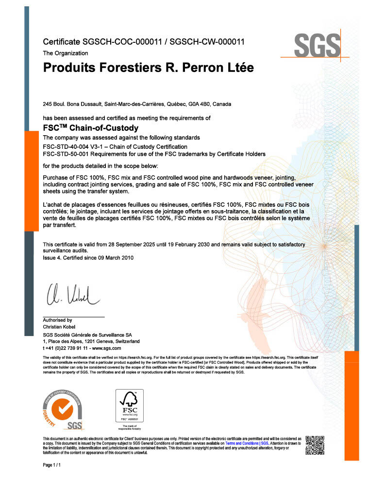 Afin de répondre aux exigences en matière d’environnement et de conservation de notre clientèle, nous sommes fiers de participer au programme de certification de chaîne de traçabilité FSC® (Forest Stewardship Council®) depuis 2010.